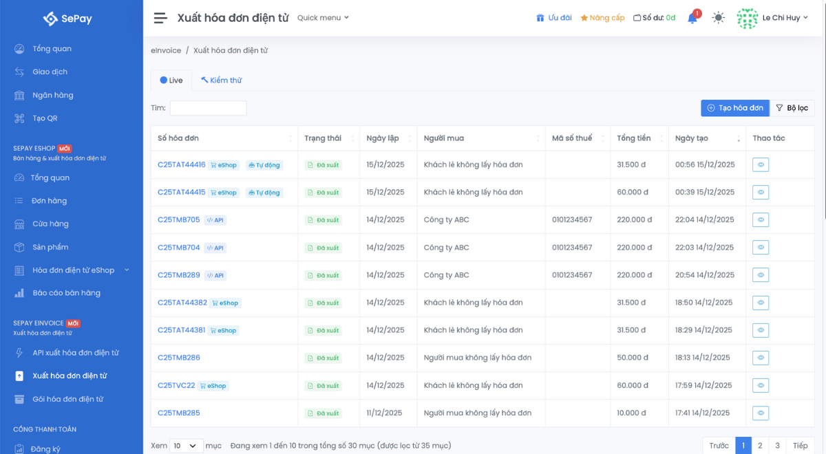 - Cấu hình tự động xuất hóa đơn điện tử với sự kết hợp SePay eInvoice: Chủ shop có thể thiết lập điều kiện để hệ thống tự xuất hóa đơn điện tử theo giá trị giao dịch/ đơn hàng hoặc loại dịch vụ.
